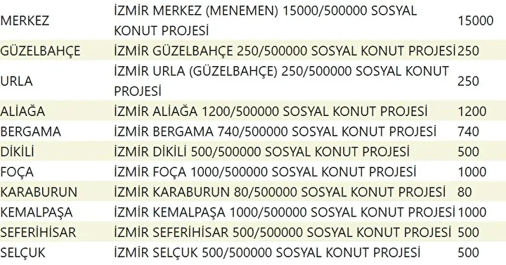 İzmir’de ise 21 bin 20 konutun yapılacağı ilçeler, Menemen, Güzelbahçe, Urla, Aliağa, Bergama, Dikili, Foça, Karaburun, Kemalpaşa, Seferihisar ve Selçuk olarak belirlendi.