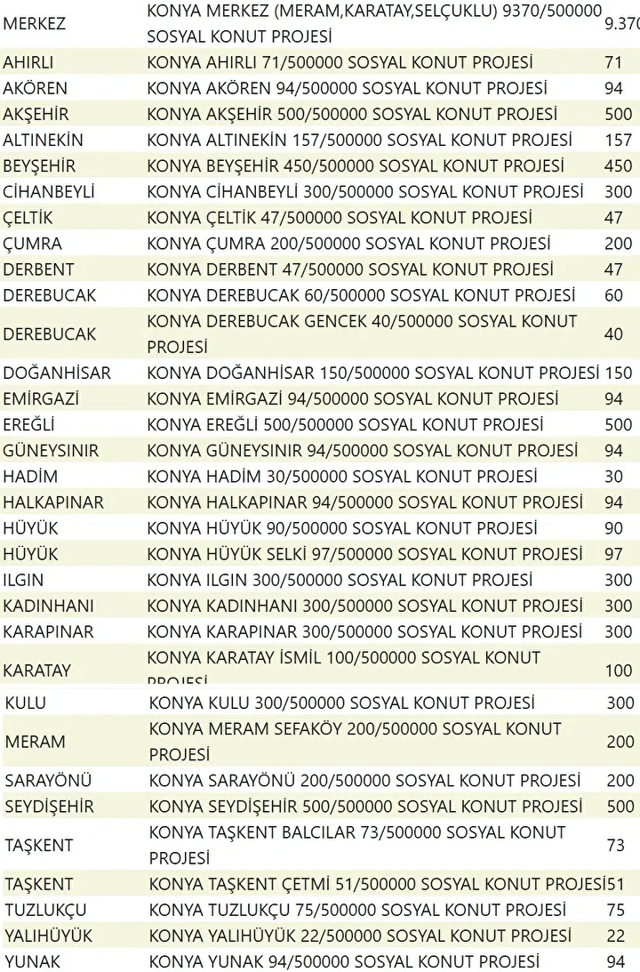 Konya’da 15 bin konut, Meram, Karatay, Selçuklu, Ahırlı, Akören, Akşehir, Altınekin, Beyşehir, Cihanbeyli, Çeltik, Çumra, Derbent, Derebucak, Doğanhisar, Emirgazi, Ereğli, Güneysınır, Hadim, Halkapınar, Hüyük, Ilgın, Kadınhanı, Karapınar, Kulu, Sarayönü, Seydişehir, Taşkent, Tuzlukçu, Yalıhüyük ve Yunak ilçelerinde yapılacak.