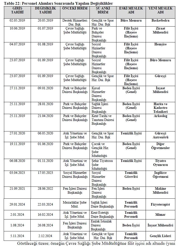 Belediyeye bağlı İnsan Kaynakları A.Ş. üzerinden yapılan alımlarda pozisyonlar çoğunlukla “Beden İşçisi”, “Temizlik İşçisi”, “Filit İşçisi (Haşere İlaçlama)” gibi vasıfsız kategorilerden açıldı. Ancak bu personelin çok kısa sürelerde meslek kodları değiştirilerek mühendis, mimar, hemşire, fizyoterapist, öğretmen, arkeolog gibi özel uzmanlık ve üst öğrenim gerektiren birimlere kaydırıldığı tespit edildi.