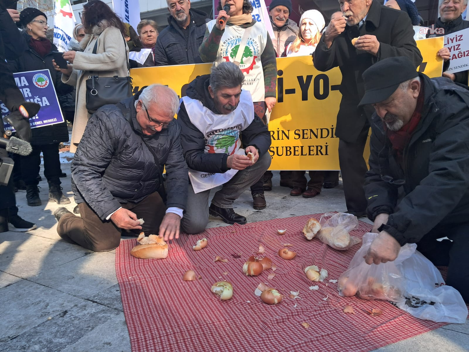 Basın açıklamasının ardından emekliler, geçim koşullarına dikkat çekmek amacıyla kuru soğan ve ekmek tükettiler. Emekliler, artan hayat pahalılığı karşısında temel gıdaya dahi erişimin zorlaştığını belirterek, kuru soğan ve ekmekle geçinmeye mahkum edildiklerini ifade ettiler.