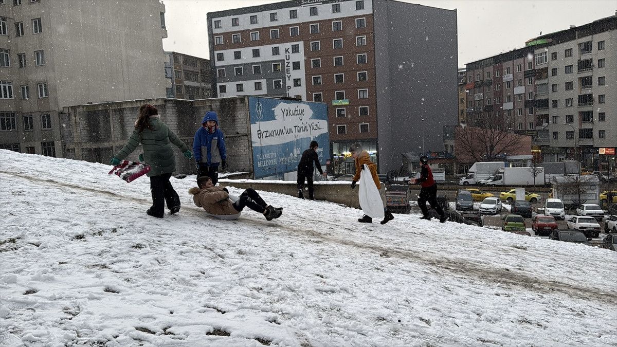 Erzurum’da aralıklarla etkisini sürdüren kar yağışı, özellikle çocuklar için günün en keyifli anlarına dönüştü. Mahalle aralarındaki yamaçlara çıkan çocuklar, karı fırsata çevirdi.