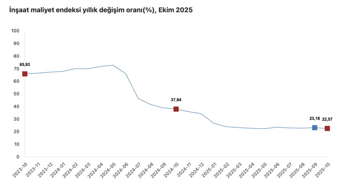 İnşaat maliyet endeksi 2025 yılı Ekim ayında, bir önceki aya göre yüzde 0,98 arttı, bir önceki yılın aynı ayına göre yüzde 22,57 arttı.