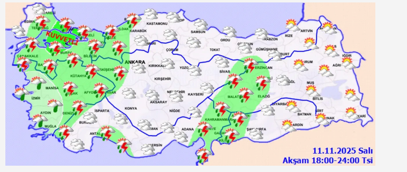 Meteoroloji Genel Müdürlüğü, 11 Kasım 2025 tarihli hava tahmin raporunu yayımladı. Yapılan değerlendirmelere göre, Türkiye bugünden itibaren soğuk ve yağışlı havanın etkisine girecek.